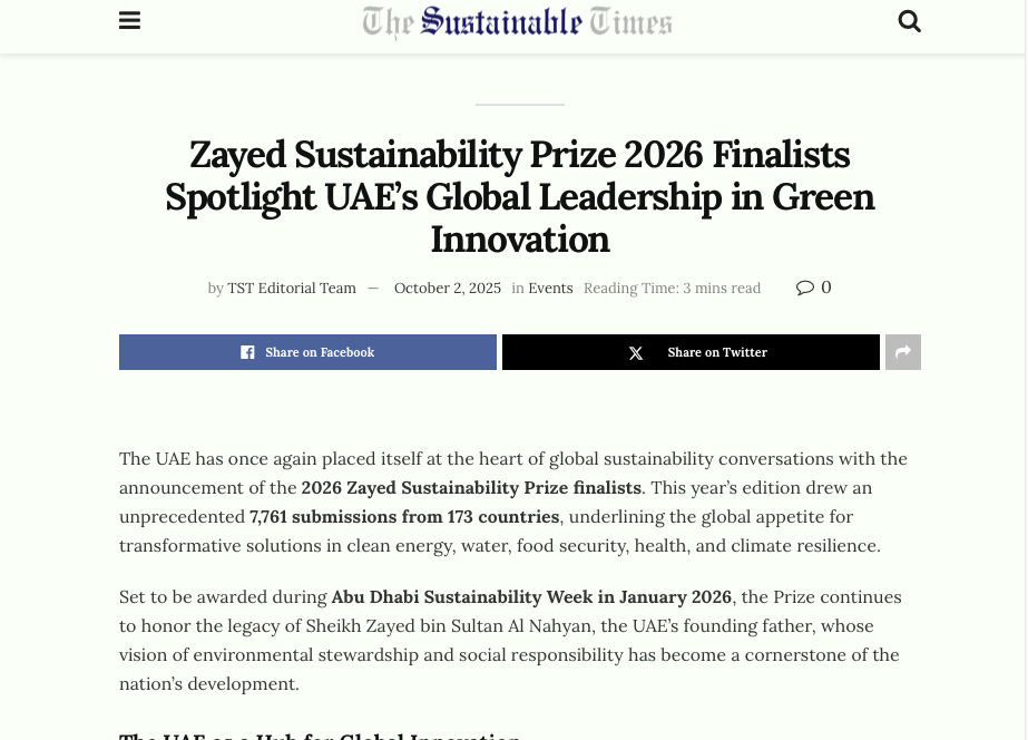Zayed Sustainability Prize 2026 Finalists Spotlight UAE's Global Leadership in Green Innovation
