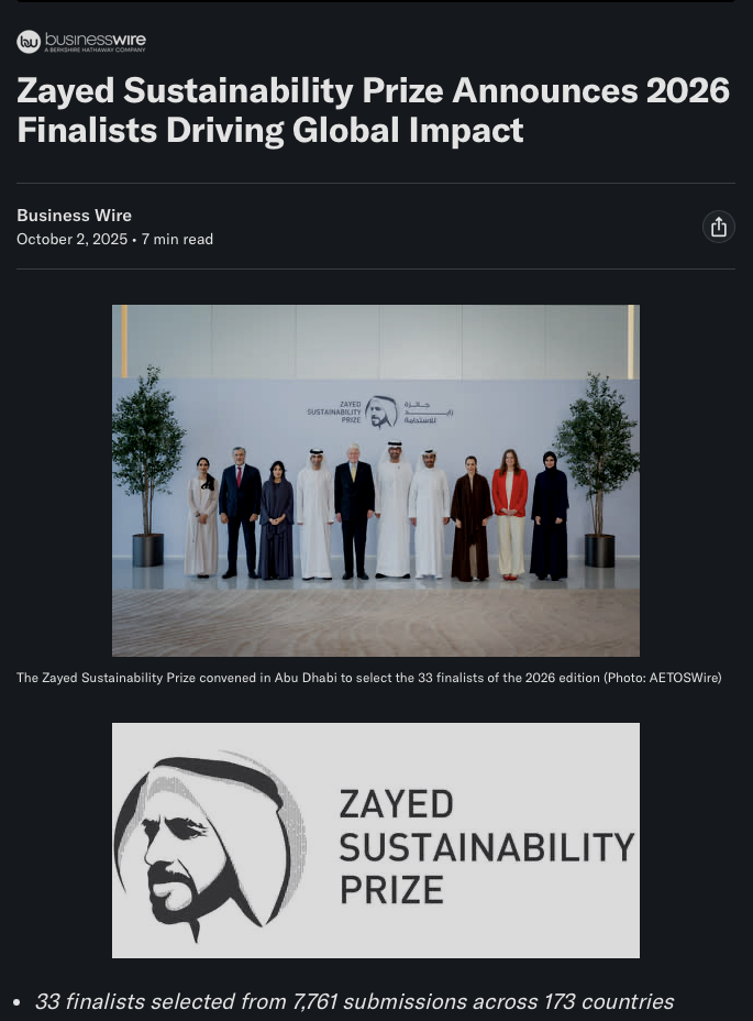 CLIC RECYCLE featured in YahooFinance Business Wire: Zayed Sustainability Prize Announces 2026 Finalists Driving Global Impact